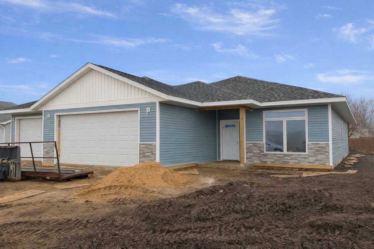 Welcome to this brand new single-family home offering easy one-level living with 3 bedrooms and 2 bathrooms. The spacious open floor plan is filled with natural light and features a bright kitchen with quartz countertops, a center island, and a walk-in pantry. The living room showcases a tray ceiling, adding a custom touch, and flows seamlessly to the covered patio?perfect for extending your living space outdoors.The primary owner's suite also features a tray ceiling, along with a walk-in closet and a private bathroom complete with double sinks, a toilet, and a step-in shower. Two additional bedrooms, a guest bathroom, and a laundry room with a sink and extra storage round out the interior.Outside, you'll appreciate the home's timeless curb appeal with blue siding, vertical white accents, and stone detailing. A heated three-stall garage with a floor drain adds both comfort and convenience. Move in and enjoy!